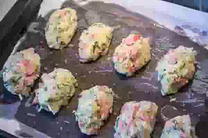 8. Руки смазать растительным маслом и слепить картофельные котлеты. Уложить их на застеленный пекарской бумагой или фольгой противень. Перед запеканием можно смазать их маслом или взбитым яйцом. Запекать в предварительно разогретой до 180С духовке 20-25 минут, пока они не подрумянятся. Готовые котлеты подавать гоячими со свежей зеленью, овощным салатом и соусом.