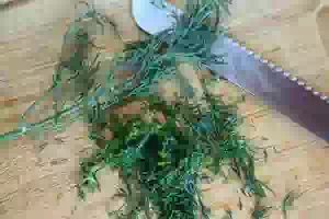 5. Свежую зелень вымыть, обсушить на бумажном полотенце и мелко порубить. У нас был укроп, но подойдет петрушка или зеленый лук.