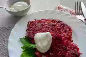 7. Выкладываем оладьи из свеклы с кабачком на бумажные полотенца, чтобы убрать излишек масла. Готовые оладьи подаем горячими с соусом по вкусу.