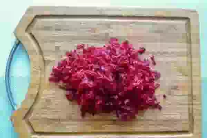 3. На более мелкой терке натираем свеклу. Свекла жестче, чем кабачок, поэтому её надо натирать мельче кабачка. Тогда время приготовления у овощей будет одинаковым.