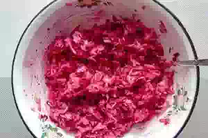 3. На более мелкой терке натираем свеклу. Свекла жестче, чем кабачок, поэтому её надо натирать мельче кабачка. Тогда время приготовления у овощей будет одинаковым.