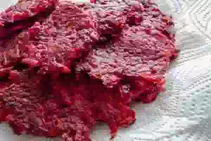 7. Выкладываем оладьи из свеклы с кабачком на бумажные полотенца, чтобы убрать излишек масла. Готовые оладьи подаем горячими с соусом по вкусу.