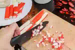 1. Яйца отварить вкрутую, переложить в холодную воду и остудить. Крабовые палочки мелко порезать.