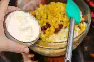 4. В небольшую миску с майонезом добавить пропущенный через пресс чеснок. Хорошо перемешать заправку для салата.
