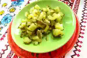 1. Для салата «Подсолнух» можно взять как малосольные, так и свежие огурцы. Мелко нарезаем их кубиками.