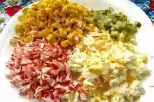 4. Все ингредиенты для салата «Подсолнух» смешиваем, добавляем консервированную кукурузу и заправляем по вкусу майонезом.