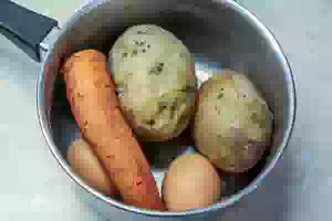 1. Овощи для салата сварить или запечь в духовке, обернув овощи в фольгу при 200С примерно 40 минут. Отдельно сварить яйца вкрутую. Положить их в холодную воду, и как только вода закипит, варить 10 минут. Вареные яйца переложить в холодную воду, дать им остыть и очистить.