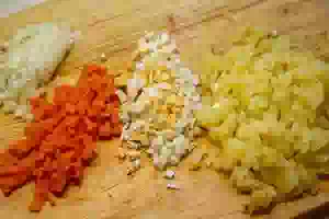 2. Картофель и морковь очистить, порезать маленькими кубиками. Или натереть на крупной терке. Свеклу очистить и измельчить на крупной терке. Очищенные яйца мелко порубить.