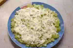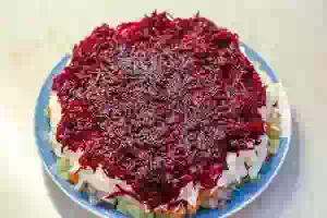 12. На него выдавить немного майонеза и размазать ложкой или лопаткой. Убрать салат на ночь в холодильник. За ночь все слои пропитаются соусом, и тогда салат будет проще нарезать порциями и перекладывать на тарелку - майонез будет удерживать все ингредиенты между собой и на тарелке порция будет держать форму, а не рассыпаться. Салат Сельдь под шубой с плавленым сыром готов к подаче.