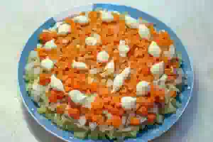9. Поверх морковного слоя распределить измельченные яйца. Снова промазать этот слой майонезом.