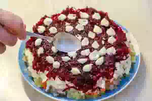 7. распределить селедку. Посыпать по желанию мелко нарезанным репчатый луком.