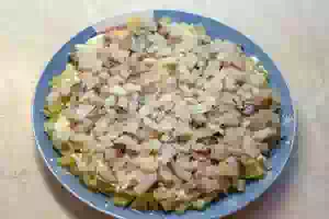 7. распределить селедку. Посыпать по желанию мелко нарезанным репчатый луком.