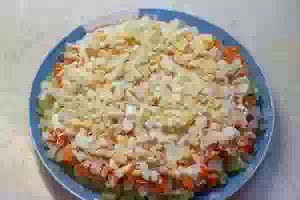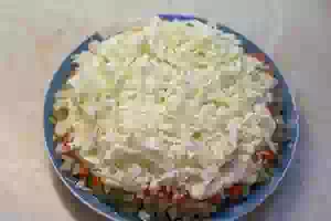 9. Поверх морковного слоя распределить измельченные яйца. Снова промазать этот слой майонезом.