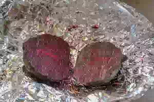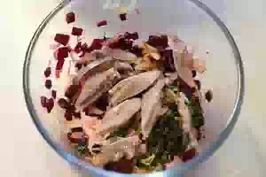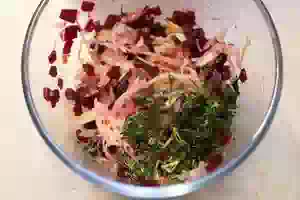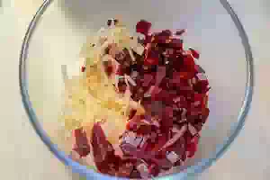1. Свеклу вымыть, обернуть фольгой, уложить на противень и запекать в духовке при 200С примерно 40 минут. Проверить готовность свеклы, проткнув ножом. Если она пропеклась, то очистить и нарезать маленькими кубиками.