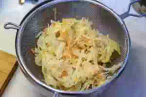 3. Квашеную капусту отжать, а если она окажется слишком кислой, то сначала промыть под проточной холодной водой, откинуть на дуршлаг и хорошо отжать. Подготовленную капусту переложить в салатник и посыпать сахаром, перемешать.
