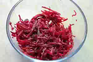 1. Сначала приготовить маринованную свеклу. Как это сделать описано в этом рецепте. Если коротко, то свеклу вымыть, сварить или запечь до готовности, после очистить и нарезать соломкой или натереть на терке для корейской моркови.