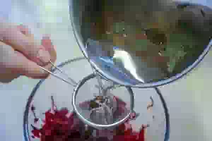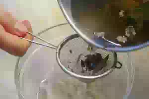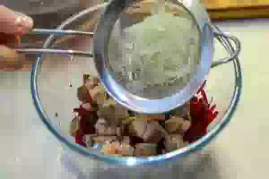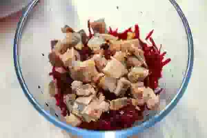 6. Откинуть маринованную свеклу на сито и переложить в салатник. Туда же добавить кусочки соленой рыбы.