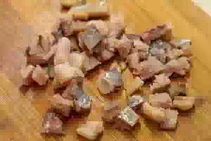 5. Когда свекла и лук промаринуются, филе сельди нарезать небольшими кубиками.