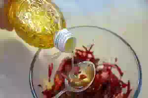 8. Полить салат ароматным растительным маслом и аккуратно перемешать. Салат из маринованной свеклы с соленой сельдью и хрустящим маринованным луком готов.
