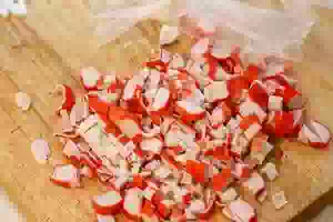 1. С крабовых палочек снять упаковку и порезать сначала кружочками толщиной примерно 5 мм, а затем порубить мелкими кубиками.