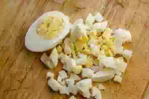 2. Сваренные вкрутую яйца порезать примерно так же как крабовые палочки.