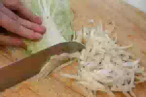3. Пекинскую капусту разобрать на отдельные листья, вымыть их под проточной водой, обсушить на бумажном полотенце. Сложить листья стопкой и тонко нашинковать. Более жесткую часть листа слегка пожамкать руками, чтобы нарезка стала мягче.