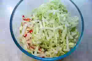 4. В салатник подходящего объема сложить рубленую пекинскую капусту, крабовые палочки, вареные яйца.