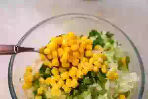 5. Туда же отправить рубленую зелень (у меня был букет из петрушки с укропом и зеленым луком) и консервированную кукурузу, с которой обязательно надо слить зелень. Посолить по вкусу и перемешать.