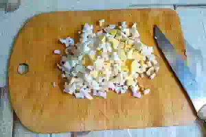1. Чтобы на приготовление салата ушло минимум времени, заранее сварите яйца и картофель в мундире. Яйца очистить, отделить 2 желтка и 1 белок для украшения, остальное - мелко порубить. Важно! Чтобы желтки вареных яиц были желтенькими и красивыми, а не синими, их нужно варить не более 10 минут после вскипания воды. Но и не менее 8 минут, иначе середина останется недоваренной.