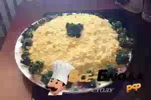 6. Последний слой - украшение салата натертыми желтками и зеленью. Перед подачей на стол дать настояться и пропитаться в холодном месте в течение 2 часов.