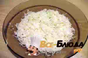 4. Лук мелко нарезать, залить кипятком и дать настояться в течении 5-10 минут для удаления горечи. Сверху на морковь положить лук, на лук - картофель, немножко посолить и смазать майонезом.