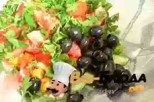 5. Всё выложите в миску, добавьте маслины, посолите. Заправьте маслом и перемешайте.