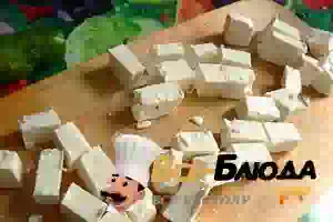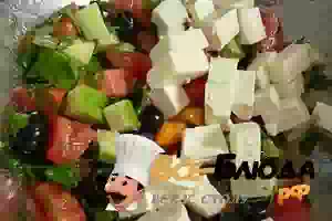 6. Фету порежьте кубиком. Для того чтобы сыр нарезался ровно - смачивайте нож холодной водой.