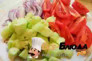 1. Помидоры режем дольками, огурцы кубиком, а лук полукольцами.