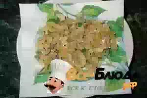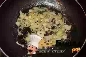 2. Лук и чеснок нарезать, обжарить на оливковом масле, добавить рисовый уксус и соевый соус.