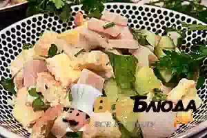 4. Вылейте яйца в небольшую, предварительно разогретую с 1 ст.л. масла сковороду. Пожарьте омлет под крышкой и остудите. Такими же кубиками порежьте свежий огурец. Посолите, добавьте 2 ст.л. растительного масла.