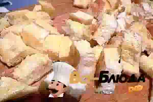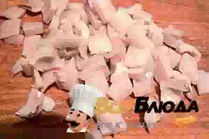 5. Омлет переложите на доску. Порежьте небольшими кубиками.