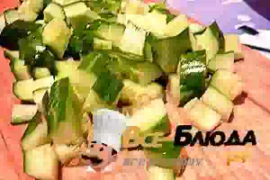 6. Такими же кубиками порежьте свежий огурец. Посолите, добавьте 2 ст.л. растительного масла.