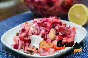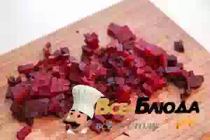1. Мытую, нечищеную свеклу обернуть фольгой и запечь в прогретой до 200С духовке до мягкости. Картофель и морковь вымыть и сварить до готовности в подсоленной воде. Слить с овощей воду, дать им остыть, очистить и порезать кубиками. Репчатый лук мелко порезать, залить холодной водой, слить воду и отжать лук. Добавить к овощам вместе с нарезанными кубиками маринованными (или солеными) огурцами.