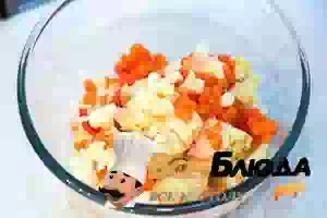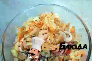 2. С готового морского коктейля (обычно в него входят кальмары, креветки, мидии и маленькие осьминожки) слить масло в отдельную миску. Морепродукты положить в салатник к овощам и перемешать.
