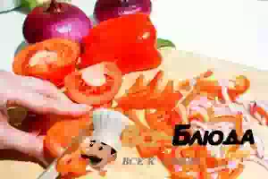 1. Овощи промыть. Перец и помидоры разрезать на половинки, удалить семена и мякоть (из помидоров). Лук тонко нарезать, ошпарить кипятком и дать воде стечь. Перец и помидоры нарезать тонкими полосками.