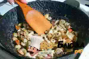 2. В сковороде растопить кусочек сливочного масла, добавить морской коктейль и, помешивая, держать морепродукты до готовности (вся жидкость должна испариться). Снять сковороду с плиты и оставить морепродукты остывать.