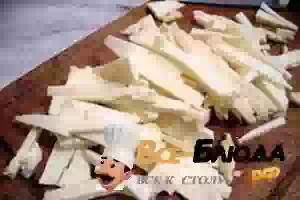 2. Сыр - соломкой. Если вместо сыра используется творог – просто оставьте крупными хлопьями.