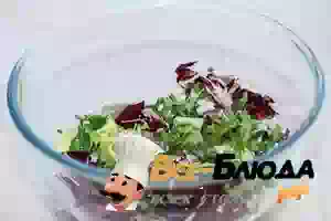 2. Положить в салатник зелень и овощи.