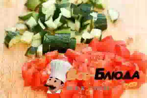 2. Овощи вымыть, обтереть салфеткой. Огурцы порезать кубиками. Помидоры нарезать дольками, удалить семена и сок, а оставшуюся часть нарезать кубиками.