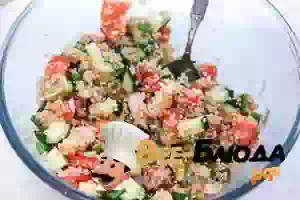 4. В салатнике смешать киноа, овощи и креветки. Посолить по вкусу.