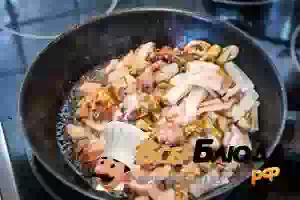 2. Добавить в чесночное масло подготовленный морской коктейль и обжарить до готовности, время от времени помешивая. Обжаренный морской коктейль переложить на тарелку, застеленную бумажным полотенцем, чтобы убрать излишек масла.