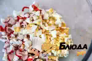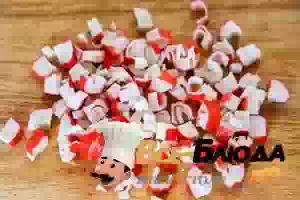 3. Крабовые палочки нарезать кубиками, переложить в салатник.