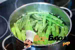 2. Довести до кипения примерно 3 литра воды, посолить и положить в воду подготовленную фасоль. Варить 3-5 минут, чтобы фасоль оставалась слегка хрустящей. Откинуть бланшированную зеленую фасоль на дуршлаг и сразу же переложить в холодную воду, чтобы стручки сохранили зеленый цвет.