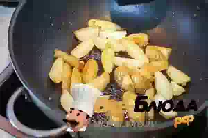 3. Вареный картофель нарезать на четвертинки и обжарить на растительном масле до румяной корочки.